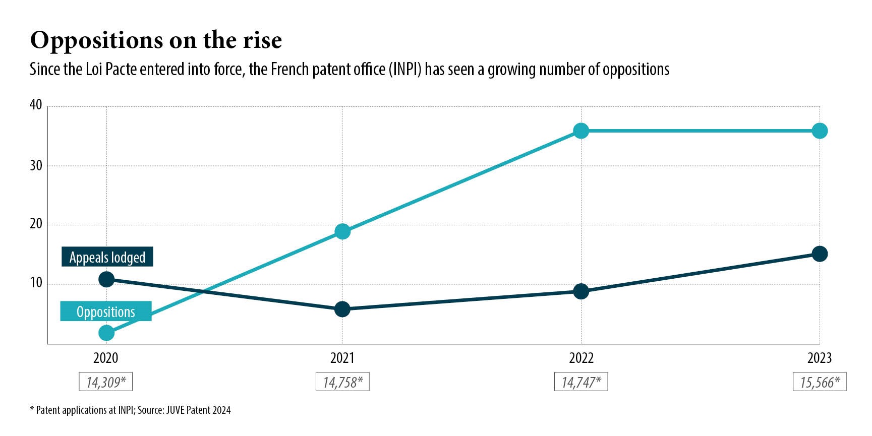 INPI figures show that the number of oppositions has increased significantly over the past four years. While parties filed two oppositions in 2020, parties filed 36 oppositions in 2023. However, their impact on appeal numbers is so far limited. In total, the INPI recorded 15 appeals against one of its decisions last year, only slightly more than the eleven appeals in 2020 when the Loi Pacte came into force.