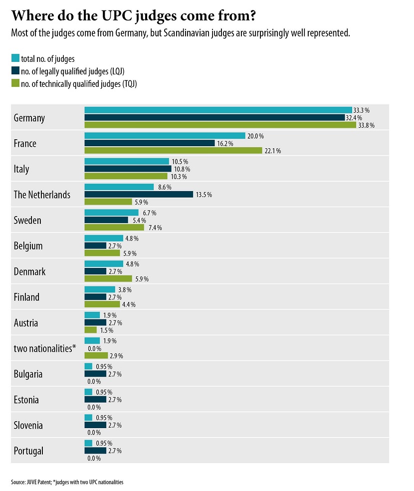 Nevertheless, the UPC system offers a strong representation for Scandinavia: Helsinki, Copenhagen and Stockholm provide three UPC divisions in the first instance, while the percentage of technically qualified judges from Denmark, Finland and Sweden is greater than that of legally qualified judges (see graphic below). Furthermore, with judge Ingeborg Simonsson, Sweden provides a Court of Appeal judge and a member of the UPC’s Presidium.