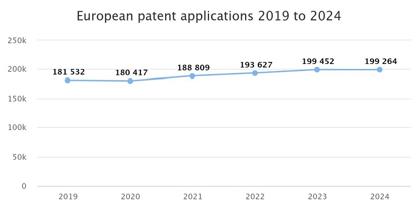 The downturn remains modest. However, in line with Europe’s economic slowdown, patent applications at the European Patent Office have declined. Between 2020 and 2023, new patent applications rose from 180,417 to 199,452. Compared to 2023, the number of new European patent applications fell by 0.1% in 2024. Inventors filed 199,264 European patents at the EPO. This is according to the Patent Index published by the EPO yesterday.